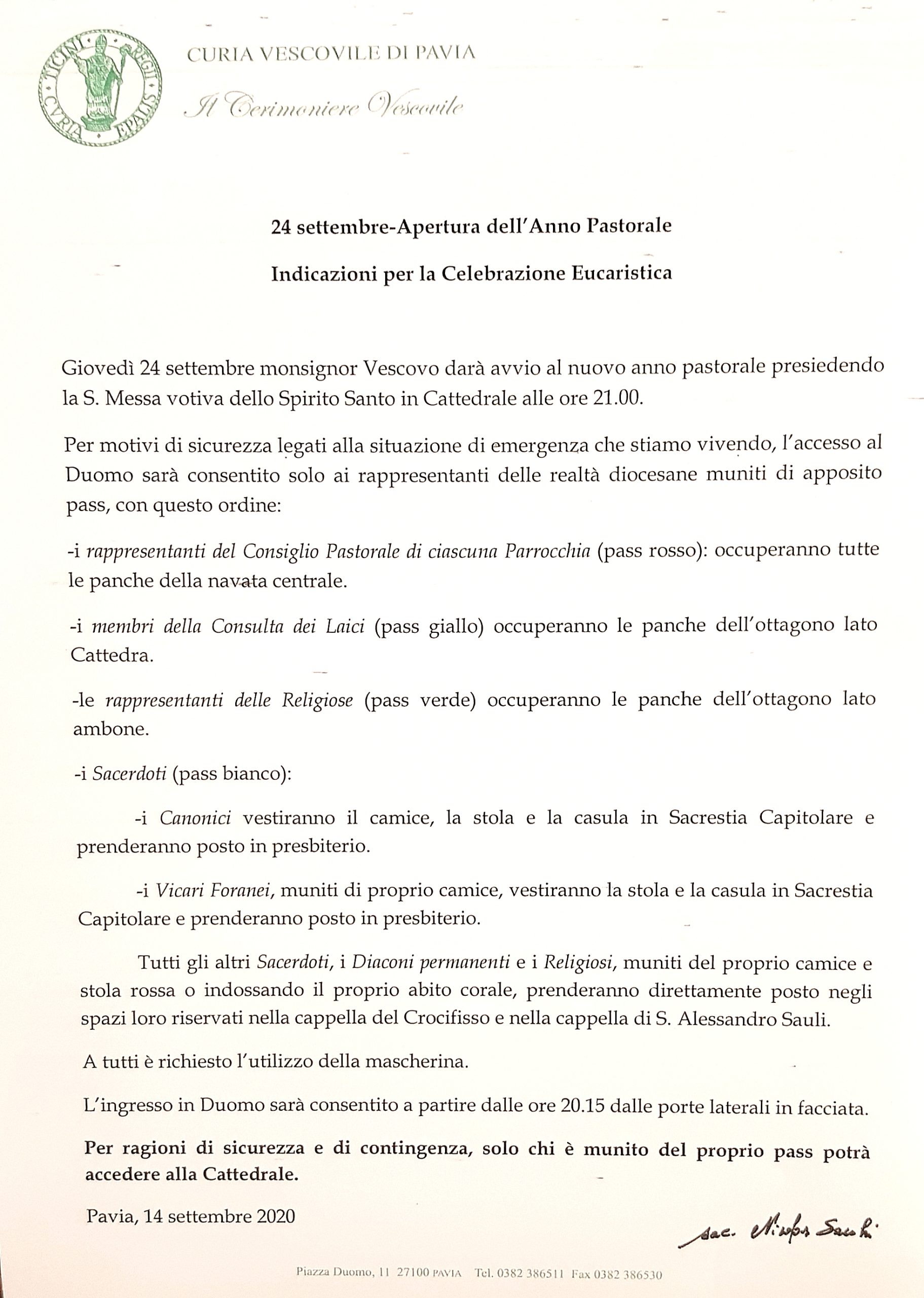 Per ragioni di sicurezza e di contingenza, solo chi è munito del proprio pass potrà accedere alla Cattedrale.