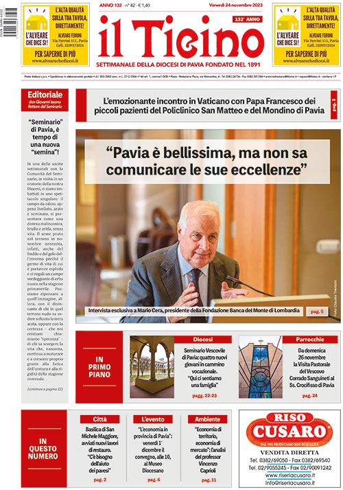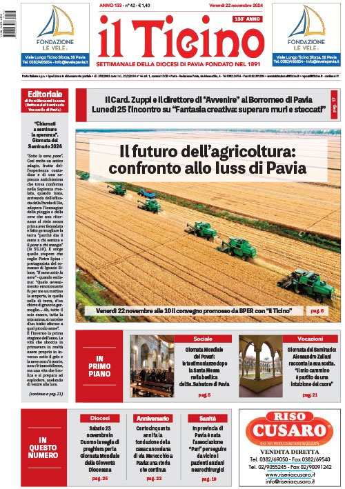 L’editoriale firmato da don Giovanni Iacono, Rettore del Seminario di Pavia, è titolato “ ‘Risplendete come astri nel mondo’: la Giornata del Seminario 2025”; alle iniziative legate al Seminario Vescovile, con gli appuntamenti in programma domenica 23 e sabato 29 novembre, sono dedicate due pagine all’interno di questo numero del settimanale.