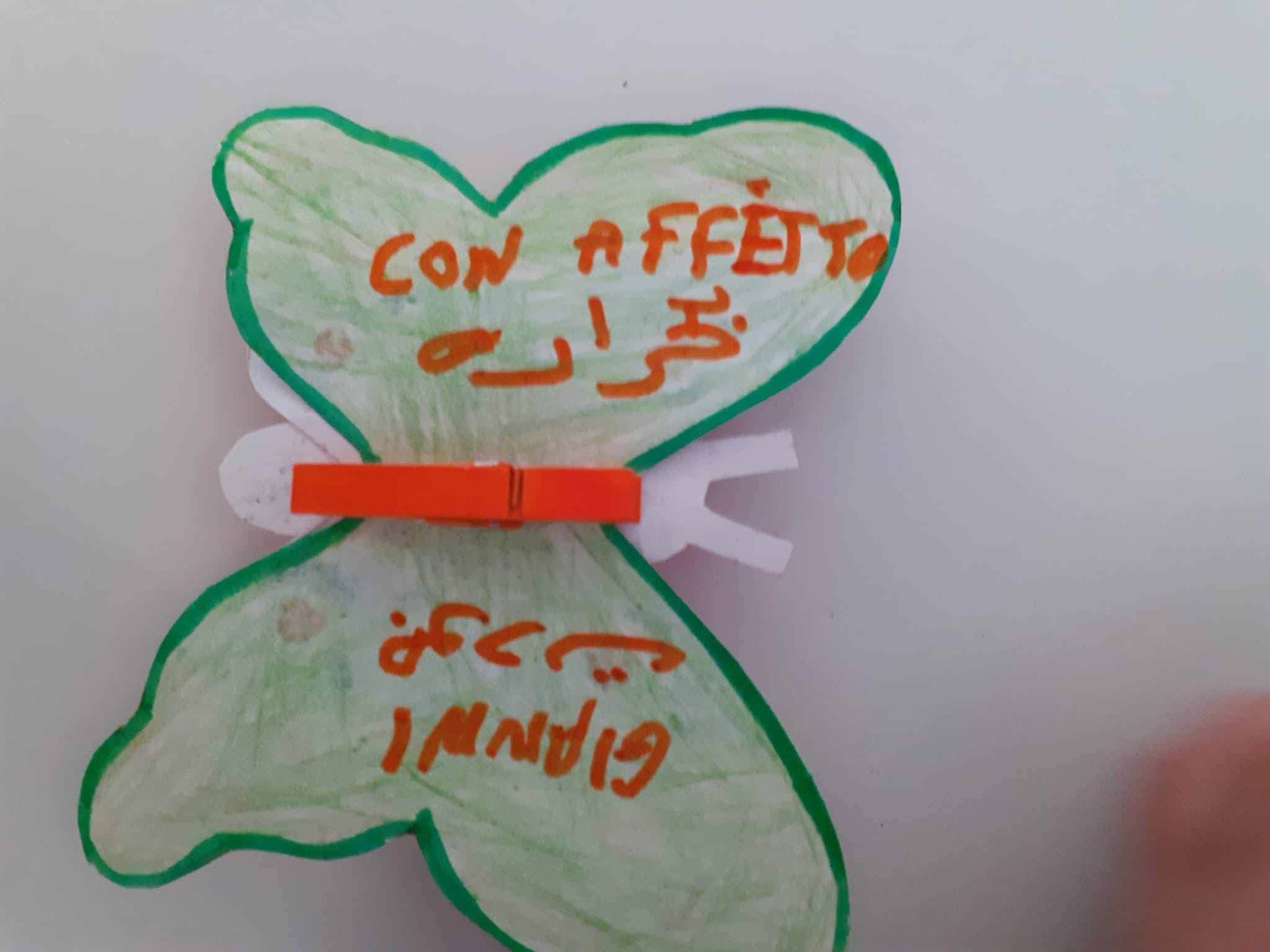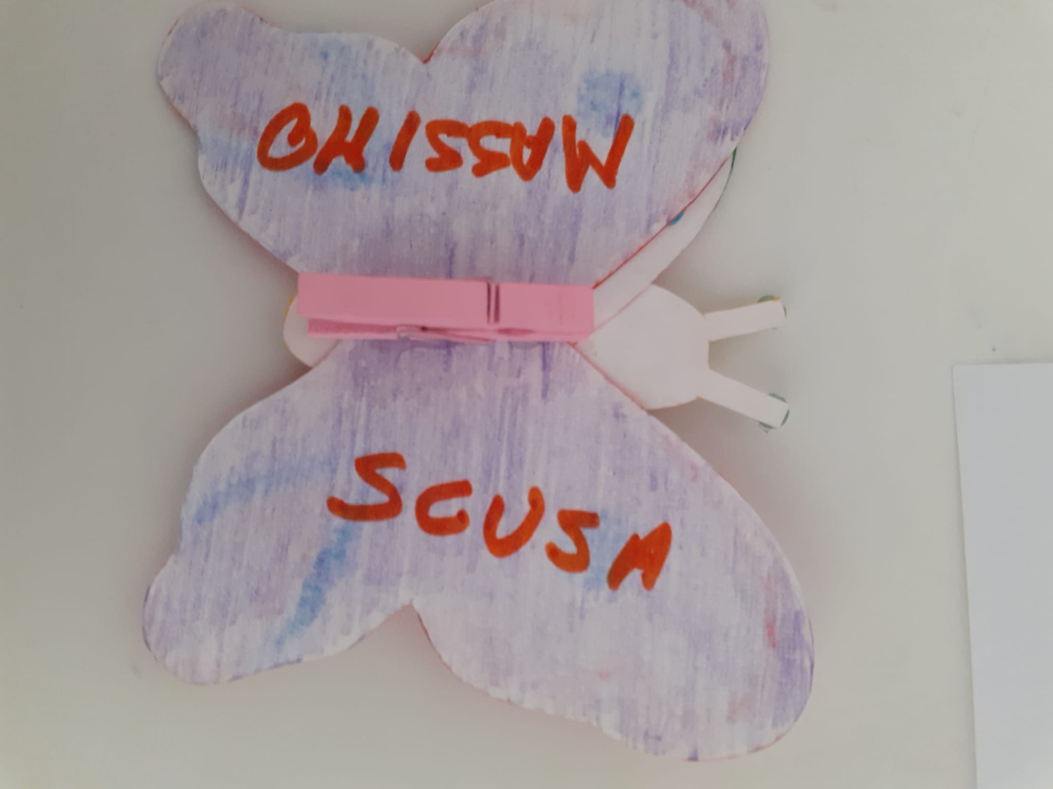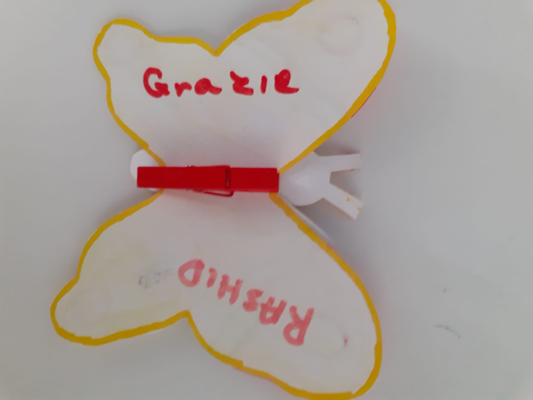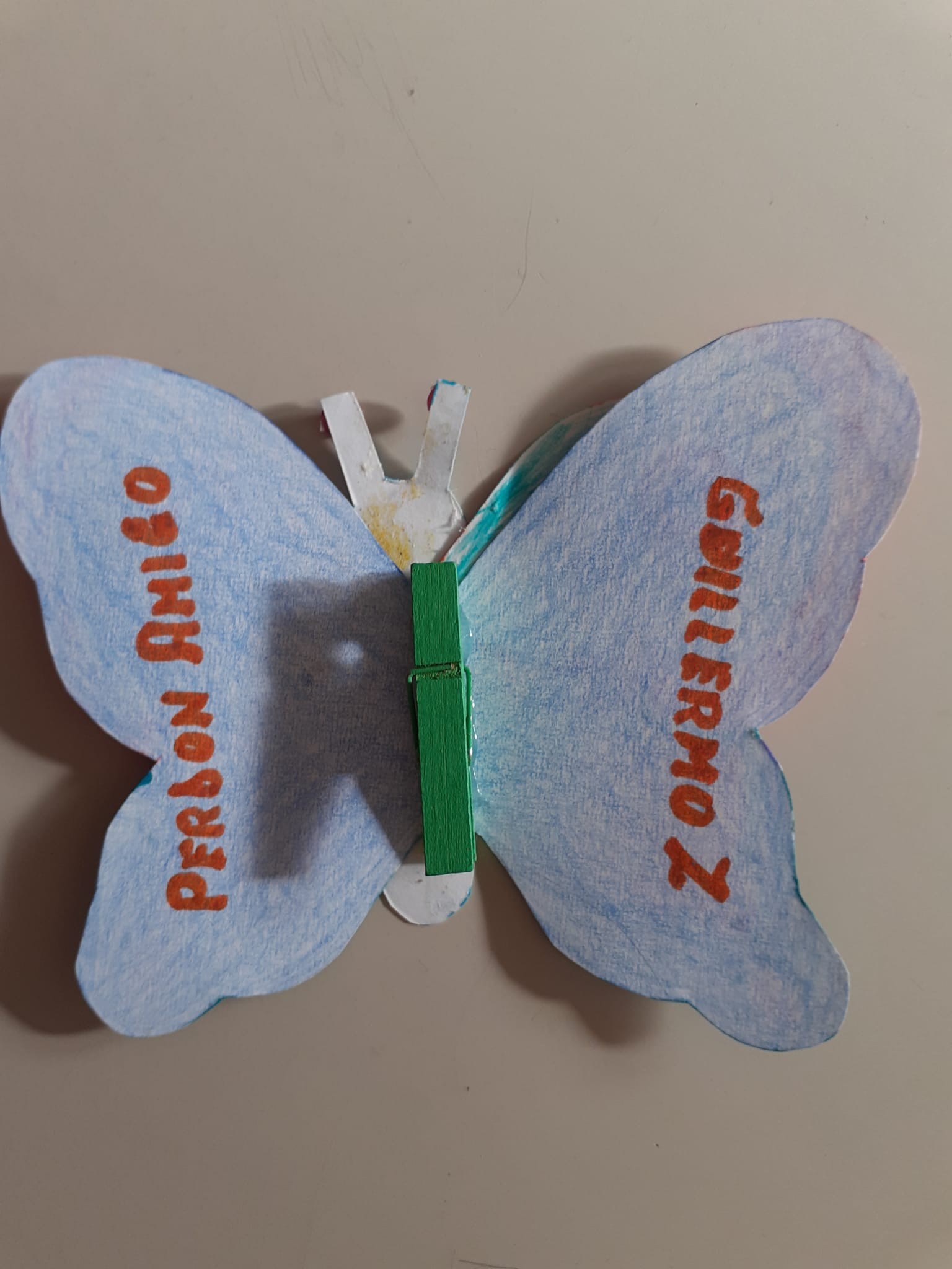 8)Valentina ci ha detto di incollare la nostra farfalla su quella che ci hanno dato dagli ospiti del dormitorio di Caritas. A me hanno dato quella di guillermo che viene dalla Spagna e c’era scritto perdon amigo e io gli ho scritto ti posso aiutare … perché aiutare un amico è molto bello gentile e importante .