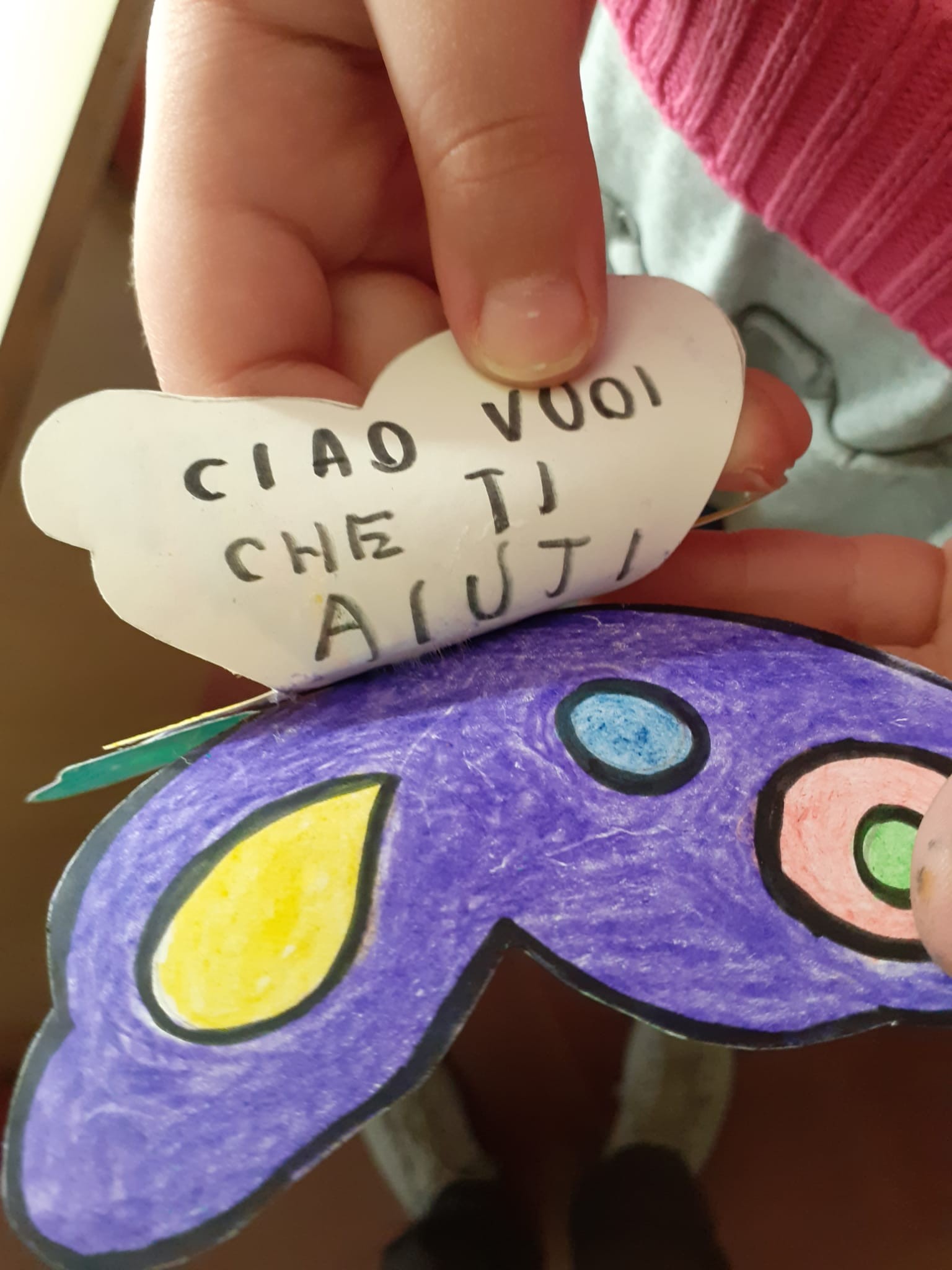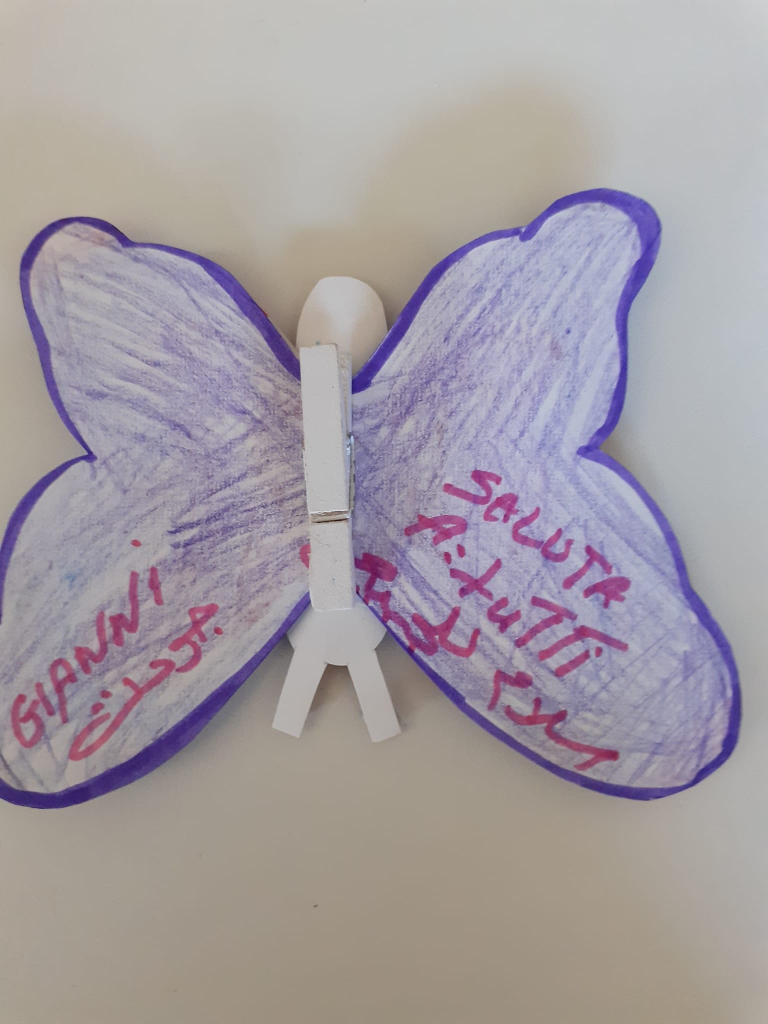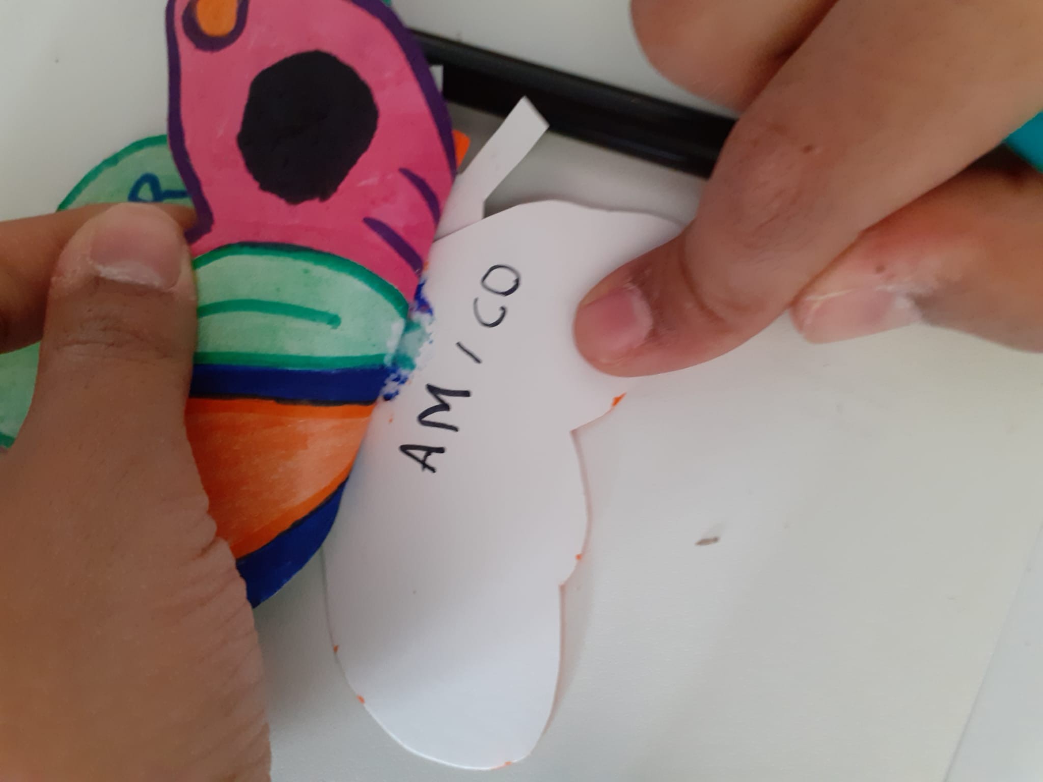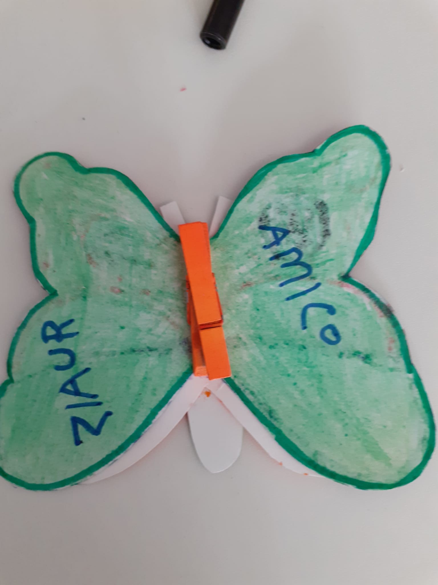 8)Valentina ci ha detto di incollare la nostra farfalla su quella che ci hanno dato dagli ospiti del dormitorio di Caritas. A me hanno dato quella di guillermo che viene dalla Spagna e c’era scritto perdon amigo e io gli ho scritto ti posso aiutare … perché aiutare un amico è molto bello gentile e importante .