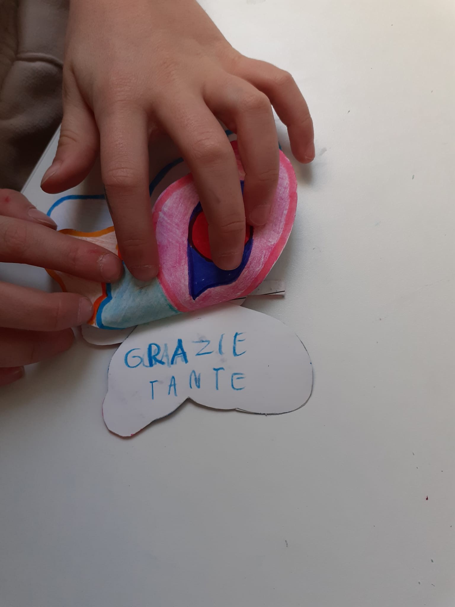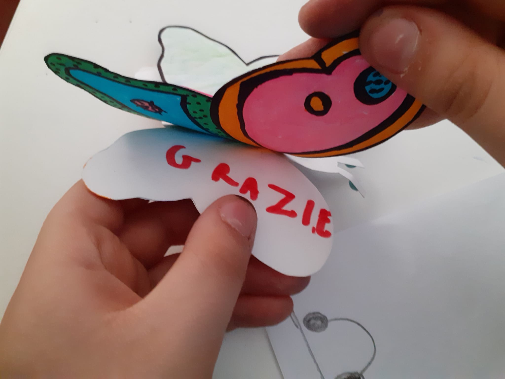 A partire da quest’ultima riflessione si è introdotto il tema dei senza fissa dimora e del dormitorio Caritas, cos’è, chi accoglie, iniziando a dare un’identità a quelle figure che per loro erano “la persona che dormiva sulla panchina” o quella “a cui mia nonna dà qualche moneta”. Per portarli a concretizzare sempre di più questa immagine si è deciso, grazie all’aiuto di una volontaria Caritas, di creare con gli ospiti del nostro dormitorio un piccolo oggetto. Gli ospiti hanno creato delle farfalle con un doppio paio di ali, da assemblare, il paio di ali più grosso è stato decorato dagli ospiti, scrivendo sul retro una parola gentile e il proprio nome. Il paio di ali più piccolo e il corpo della farfalla è stato invece assemblato dai bambini che le hanno a loro volta decorate e scritto nome e parola gentile sul retro. Le farfalle complete sono state poi appese in classe dall’insegnante. Sia i bambini che gli ospiti sono stati felici del prodotto finito, tra loro non si sono potuti conoscere, ma ognuno di loro ha dedicato una parte del proprio tempo e del proprio impegno nella costruzione condivisa di queste “farfalle della gentilezza”, ricevendo in cambio il pensiero e l’impegno di una persona sconosciuta.