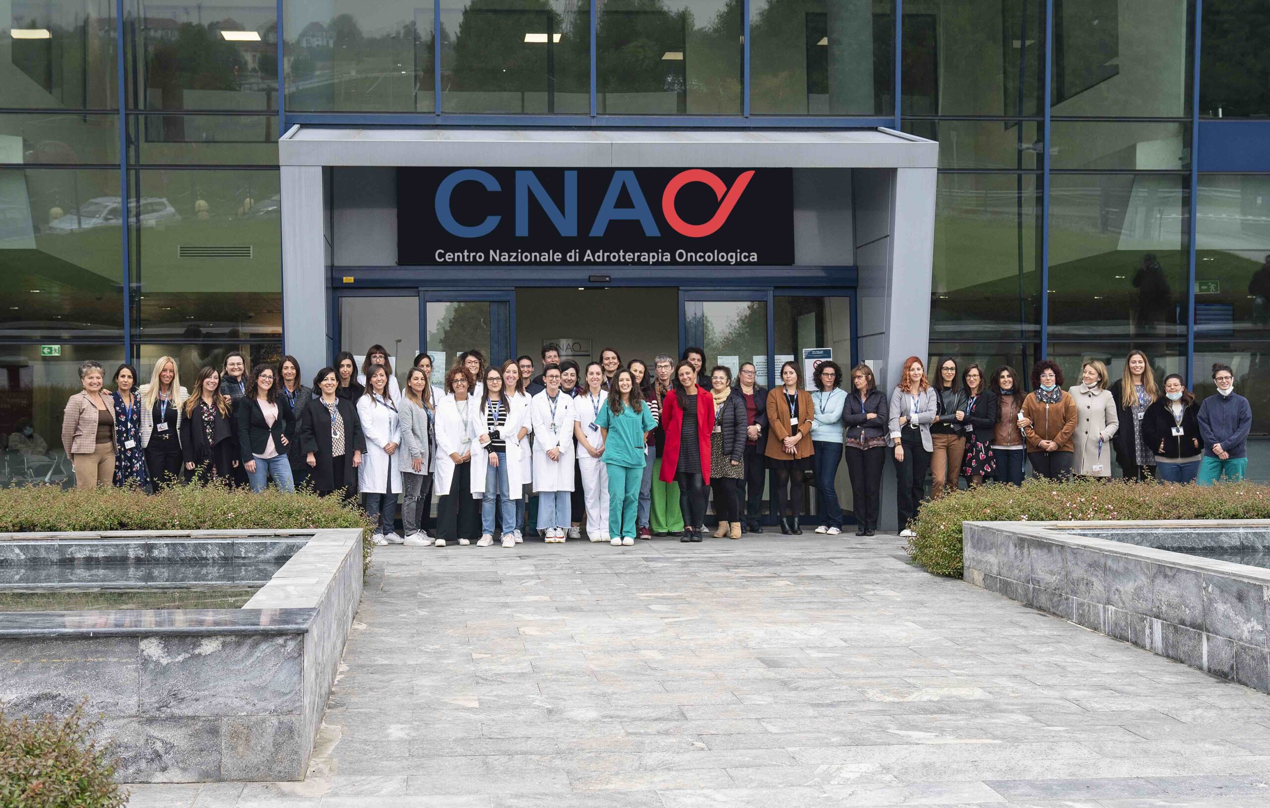 (Nella foto dell’ufficio stampa del Cnao, il personale del Centro davanti alla sede di Pavia)