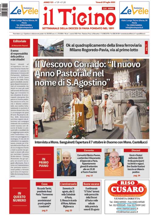 Sul numero de “il Ticino” nelle parrocchie della Diocesi di Pavia e nelle edicole di tutta la provincia da venerdì 29 luglio, il titolo di apertura della copertina è: “Il Vescovo Corrado: ‘Il nuovo Anno Pastorale nel nome di S. Agostino’. Intervista a Mons. Sanguineti: l’apertura dell’Anno Pastorale il 7 ottobre nel Duomo di Pavia con Mons. Castellucci”.