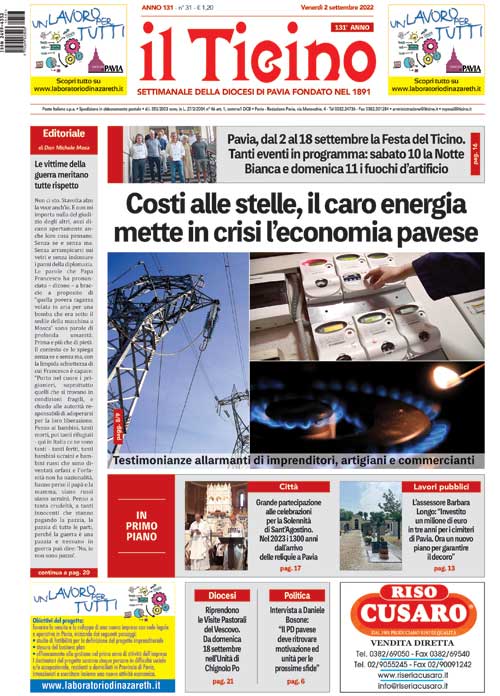 Sulla prima pagina de “il Ticino” nelle parrocchie della Diocesi di Pavia e nelle edicole di tutta la provincia da venerdì 2 settembre, il titolo di apertura è “Costi alle stelle, il caro energia mette in crisi l’economia pavese. Testimonianze allarmanti di imprenditori, artigiani e commercianti”.