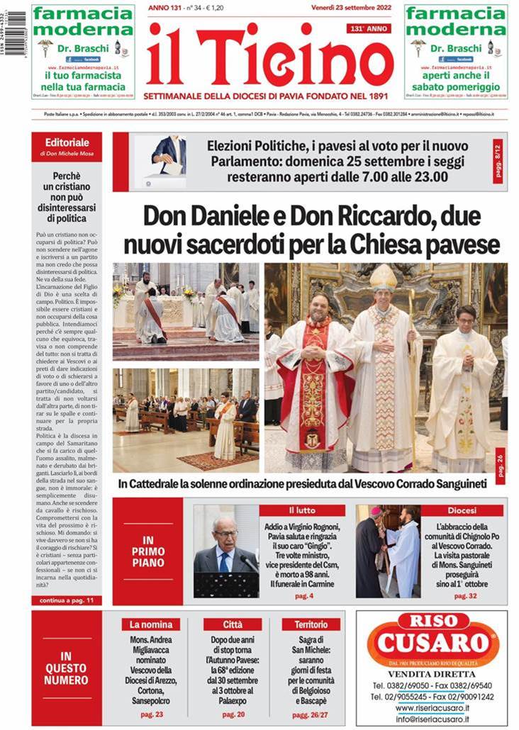 Sulla prima pagina de “il Ticino” nelle parrocchie della Diocesi di Pavia e nelle edicole di tutta la provincia da venerdì 23 settembre (un numero speciale di 40 pagine, ricco di servizi e immagini tutte a colori) il titolo di apertura è “Don Daniele e don Riccardo, due nuovi sacerdoti per la Chiesa pavese. In Cattedrale la solenne ordinazione presieduta dal Vescovo Corrado Sanguineti”.