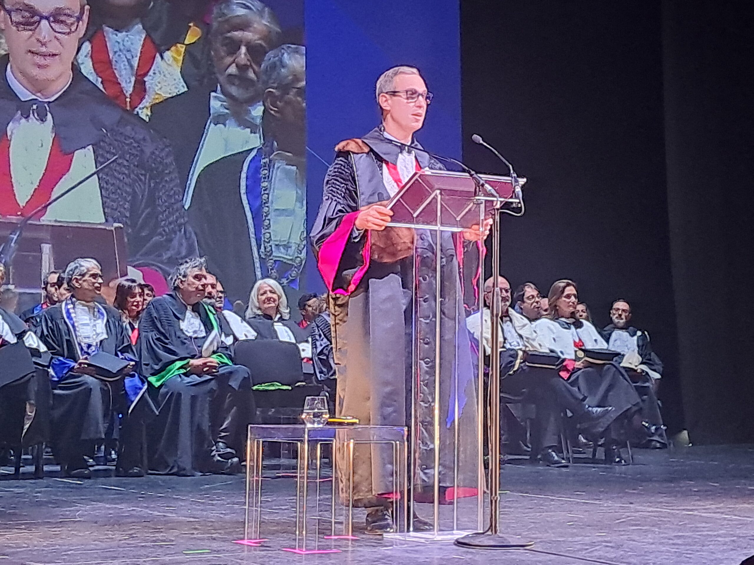 Mi è stato raccontato della grande solidarietà manifestata dai giovani italiani nelle piazze e nelle università italiane ed europee. Tutto questo è straordinario e vi fa onore. Gli esseri umani sono come le voci di una composizione di Johann Sebastian Bach, di cui, più tardi, eseguirò un piccolo assaggio. Se una voce è stonata o va fuori tempo e non si relaziona con le altre, si distrugge l’insieme. Esattamente come nella società, anche nella musica bisogna che tutte le voci siano funzionanti. In un mondo dove migliaia di persone tutti i giorni muoiono o non hanno da mangiare non si ascolta una bella partitura musicale. Oggi, nell’era della digitalizzazione, che, va evidenziato, è una benedizione, abbiamo modo di vedere cose che altrimenti non vedremmo mai e possiamo viaggiare stando seduti a casa nostra. Qualcuno direbbe che si tratta di un progresso; lo è, ovviamente. Ma è una cosa che ha fatto meglio di noi e prima di noi Johann Sebastian Bach. Senza avere un computer. E senza avere messo piede in Italia, Scrivendo il più bel concerto italiano della storia della musica. Ora vorrei dirvi i pezzi che vado ad eseguire. Il primo pezzo sarà il primo tempo del concerto italiano, dove sentiremo tutta la vivacità e creatività del barocco italiano. Poi ci sarà un momento riflessivo con l’aria dalle Variazioni Goldberg e, per finire il nostro viaggio, un vero e proprio parlamento musicale europeo che è la prima partita in si bemolle maggiore, dove i Paesi vengono rappresentati dalle varie danze di corte dell’intera comunità europea. Con una sola differenza rispetto all’Europa moderna: quella Europa era molto più accogliente e lungimirante e aveva spazio persino per le civiltà più lontane; basti pensare alla sarabanda, che era una danza persiana dal carattere molto malinconico.