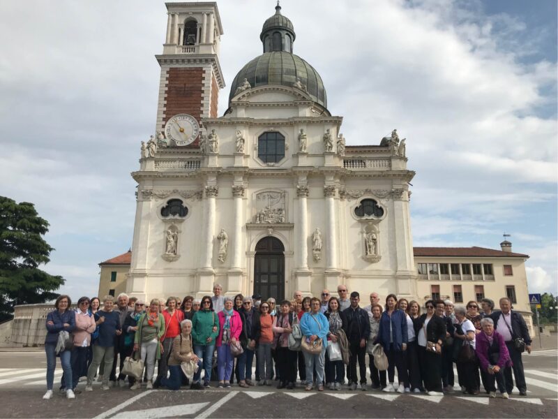 Così, avviati di buon mattino con il nostro bus guidato dall’ottimo Alessandro, siamo partiti alla volta di Vicenza. Arrivati in città abbiamo fatto un veloce giro panoramico: incamminandoci da Piazza Duomo – sede del Palazzo Vescovile con il Museo Diocesano e la Cattedrale di Santa Maria Annunciata – attraverso un dedalo di antichi e sfarzosi palazzi nobiliari, siamo giunti al Ponte San Michele sul fiume Retrone, uno dei ponti storici e percorribile solo da pedoni. Abbiamo poi proseguito sino alla Basilica Palladiana, il più celebre edificio pubblico affacciato su Piazza dei Signori con a fianco la Torre Bissara, tuttora uno degli edifici più alti di Vicenza con i suoi 82 metri, e con di fronte la residenza per il rappresentante della Repubblica di Venezia in città, ossia il Palazzo del Capitanio. Abbiamo poi proseguito sino alla Chiesa di San Gaetano e poi alla Chiesa Tempio di Santa Corona, ove è conservata una delle spine della corona di Cristo ed è collocata la Cappella Valmarana, progetta dal Palladio, sepolto nella stessa chiesa. Da qui ancora per Piazza Matteotti, dominata da Palazzo Chiericati (sede della Pinacoteca civica) e dall’ingresso al Teatro Olimpico, il primo esempio di teatro stabile coperto dell’epoca moderna, entrambi – tra gli altri – capolavori palladiani. Infine, abbiamo visitato la Chiesa di San Lorenzo nell’omonima piazza che, con un pregevole chiostrino, è officiata dai francescani conventuali: è stata davvero una bella sorpresa ritrovare al suo interno la statua di Padre Massimiliano Maria Kolbe con ex voto, degni di nota.