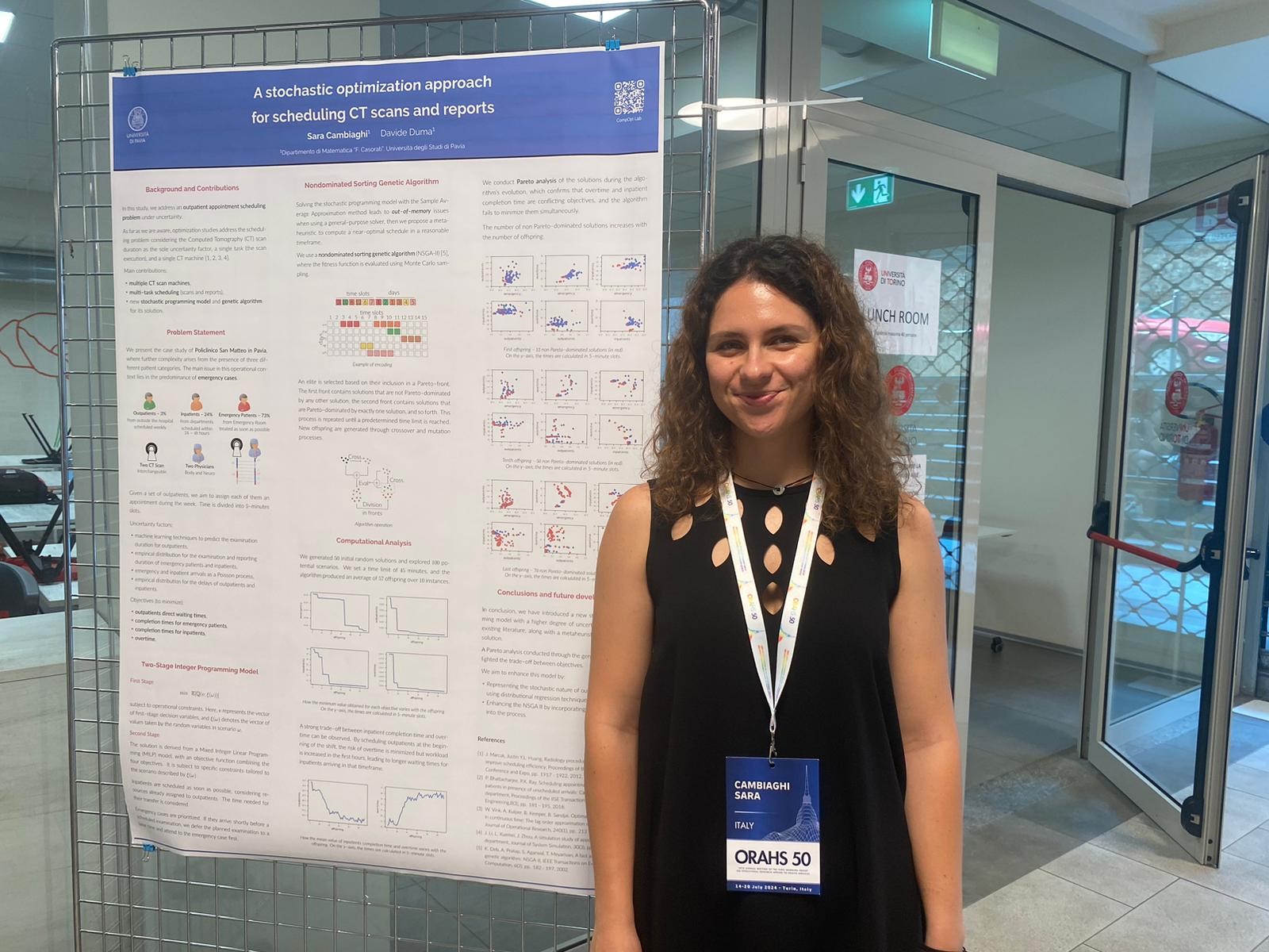 Sara Cambiaghi, iscritta al XXXIX ciclo del corso di dottorato in Computational Mathematics, Learning, and Data Science di UNIPV, ha presentato una ricerca, esemplificata in un poster, dal titolo “A Stochastic Optimization Approach for Scheduling CT Scans and Reports”.
