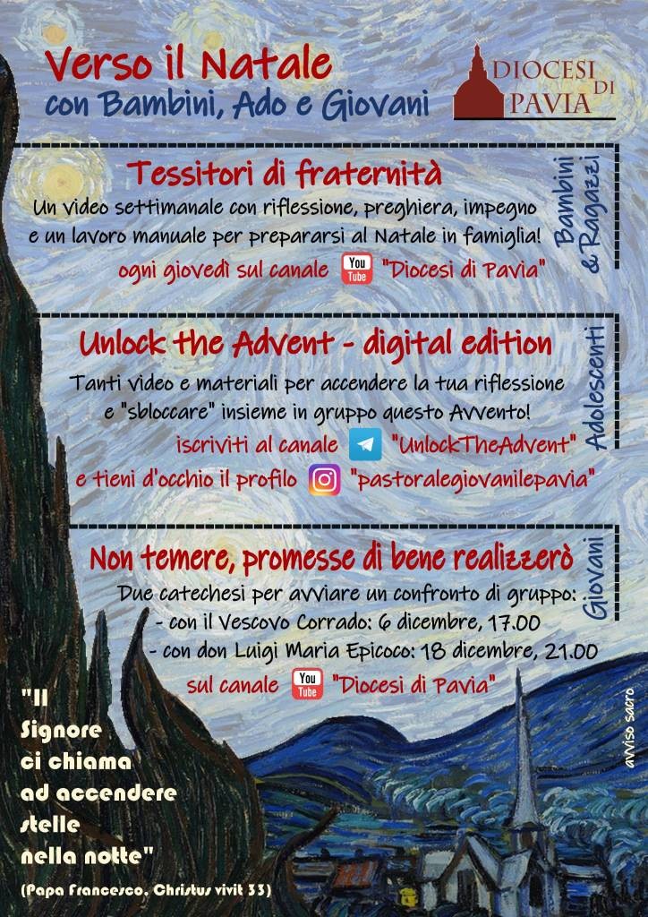 Tre percorsi di avvicinamento al Natale diversificati a seconda dell’età e che coinvolgono diversi mezzi di comunicazione, in particolare social e Youtube. La Pastorale Giovanile ha presentato la nuova proposta di cammino verso il Natale pensata appositamente per bambini e ragazzi, adolescenti e giovani: per i più piccoli ci sarà “Tessitori di Fraternità”, video settimanale dal canale Youtube diocesano con preghiera, impegno e un lavoro … Continua a leggere Verso il Natale con bambini, adolescenti e giovani »